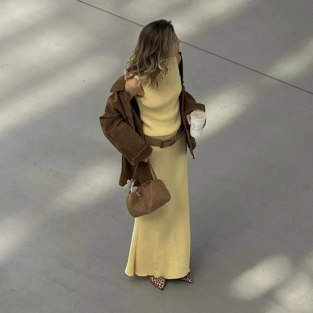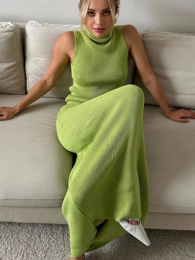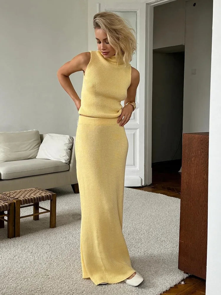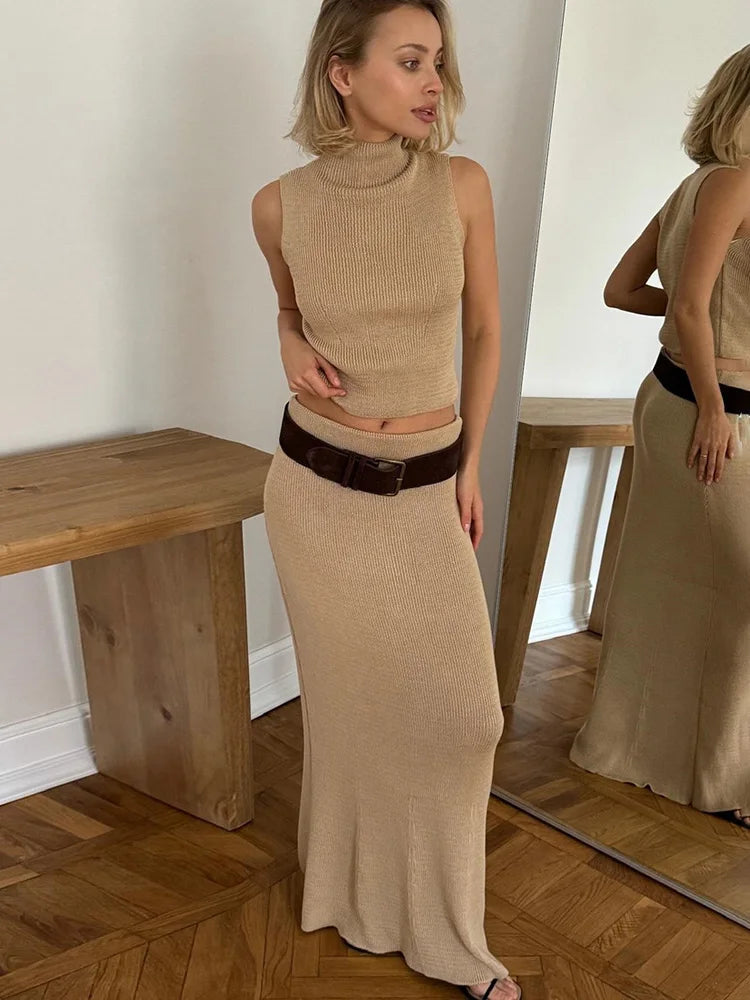 Women's Elegant Sweater Two Pieces Set Sleeveless Knitted Turtleneck Vest High Waist Skirt Set