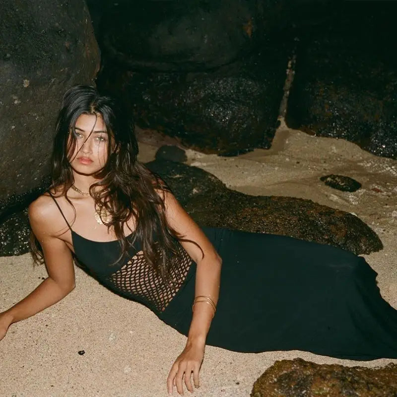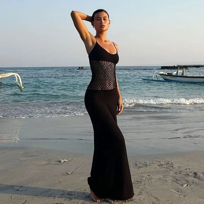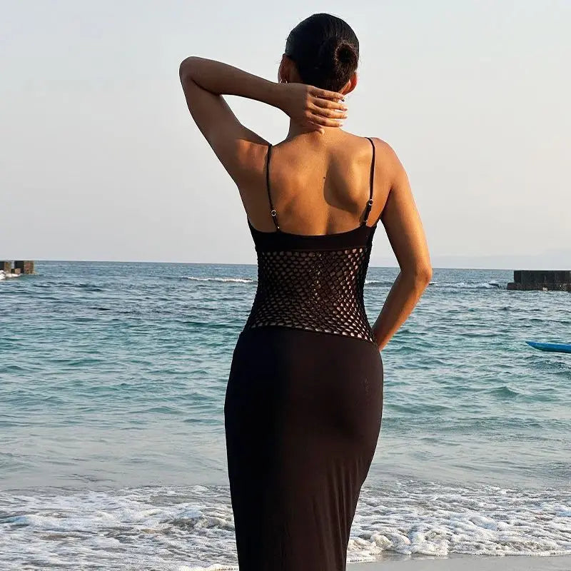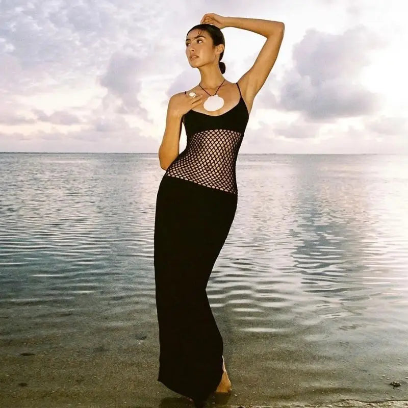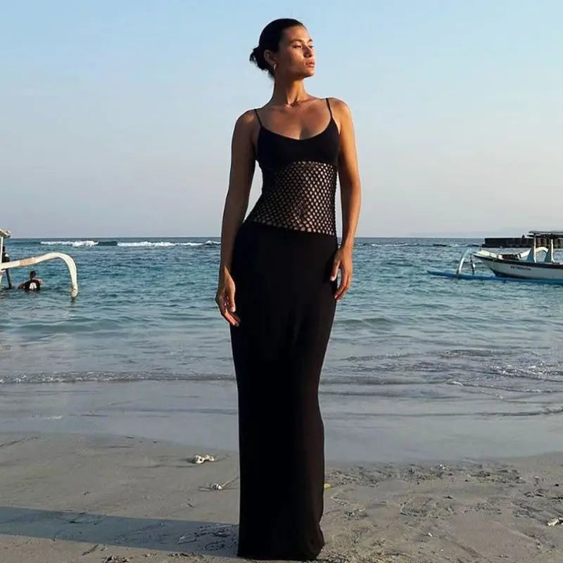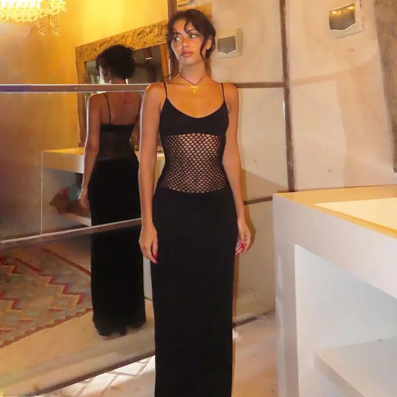 Women's Fishnet Detail Maxi Mesh Splice Slip Dress
