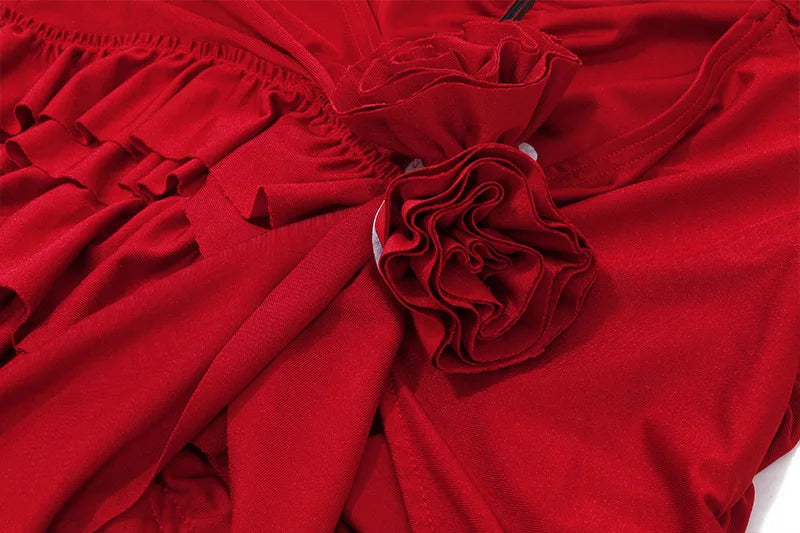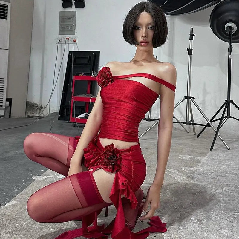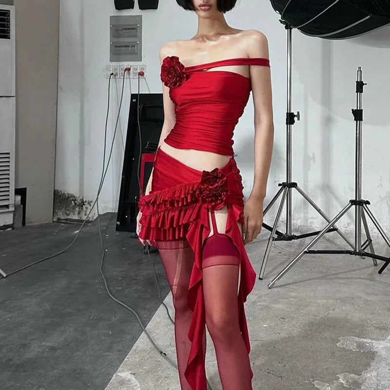 Women's Floral Applique Ruched Ruffle Detail 2 Piece Set Top and Skirt Coquette Matching Set