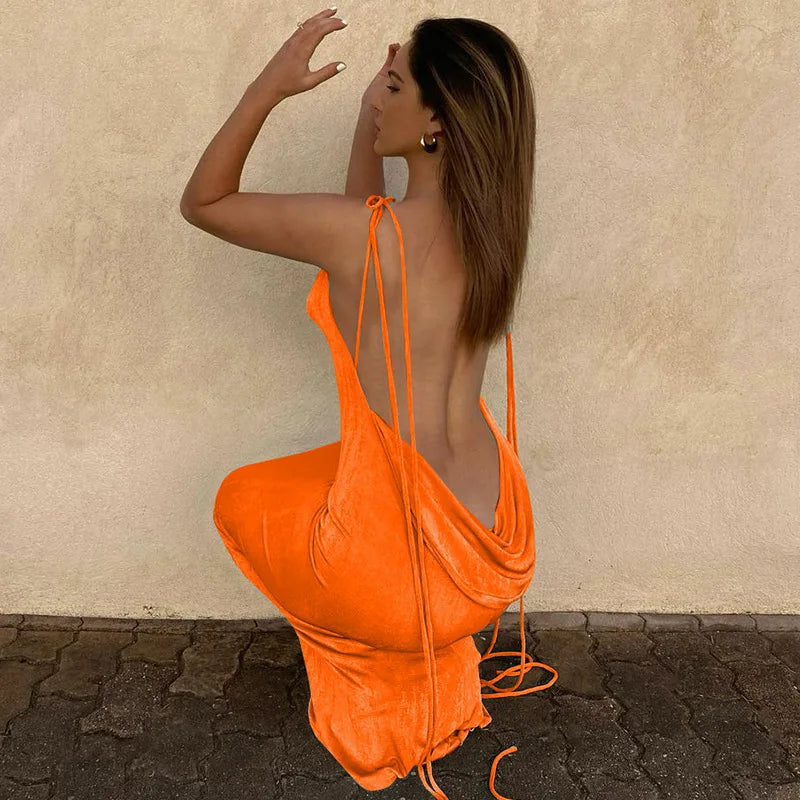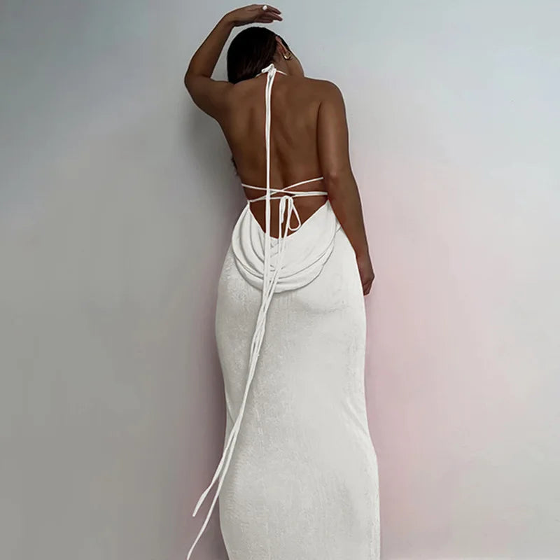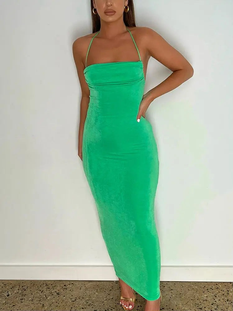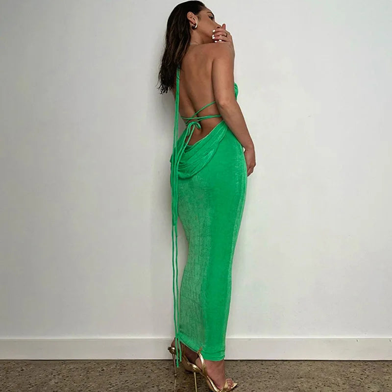 Women's Halter Backless Draped Maxi Dress - Long Straps Shift Dress