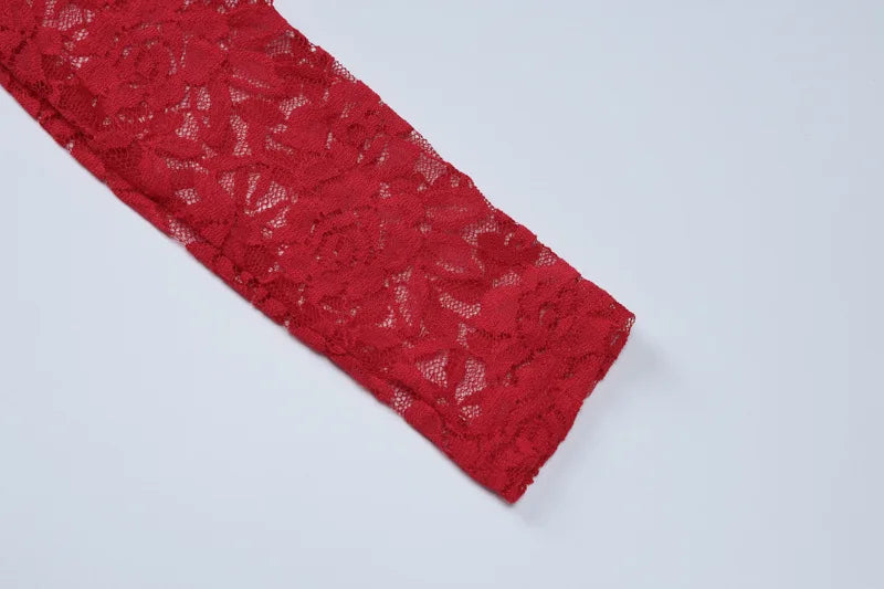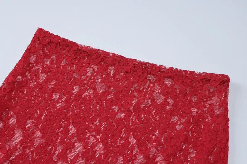 Women's Hollow Lace See Through Red Dress Set Square Neck Top and Skirt 2 Piece Set