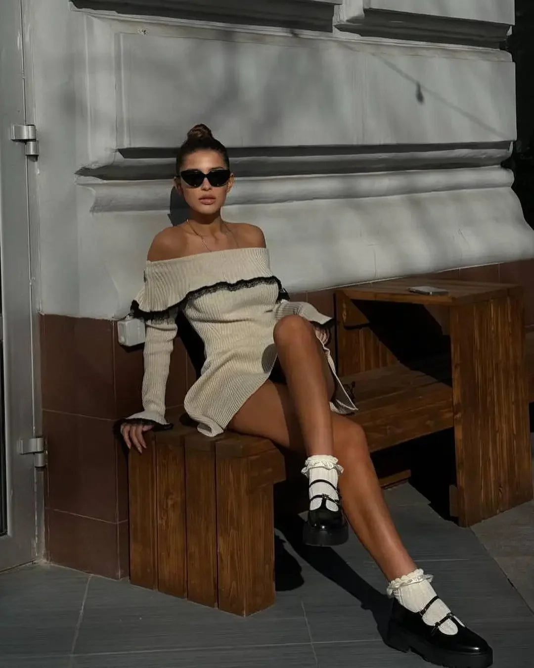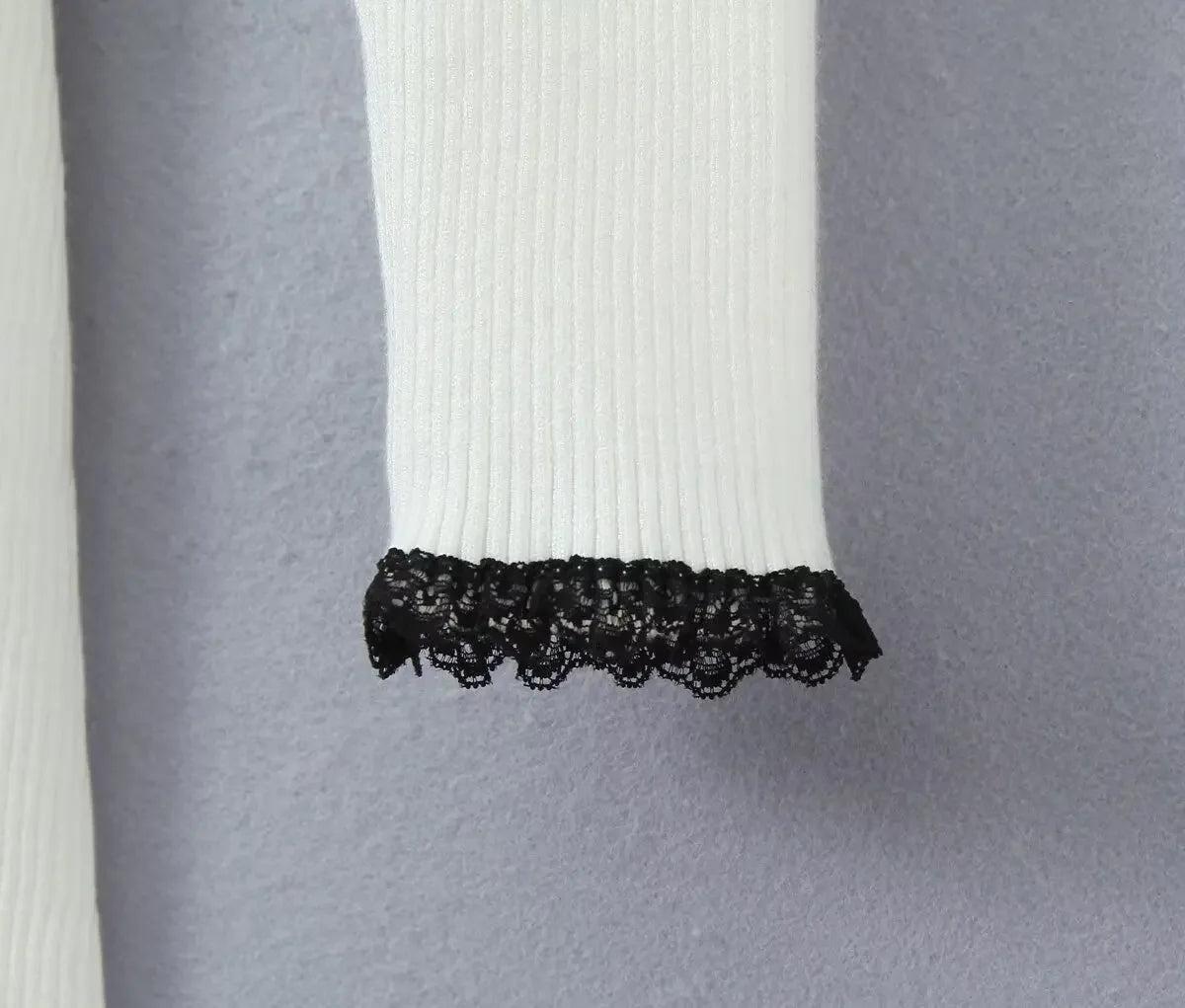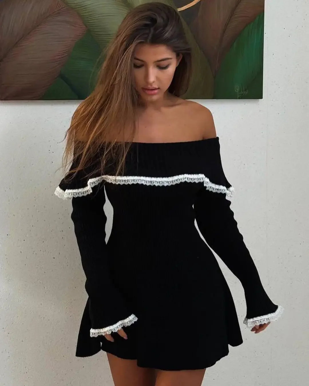 Women's Knit Off-Shoulder Sweater Mini Lace Patchwork Ribbed Slim Backless Elegant Party Knitwear Dress