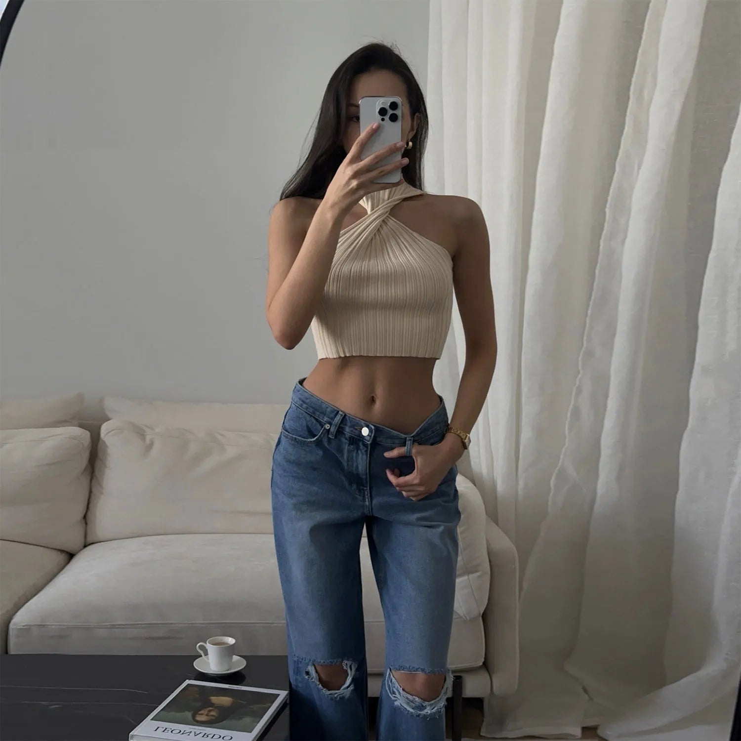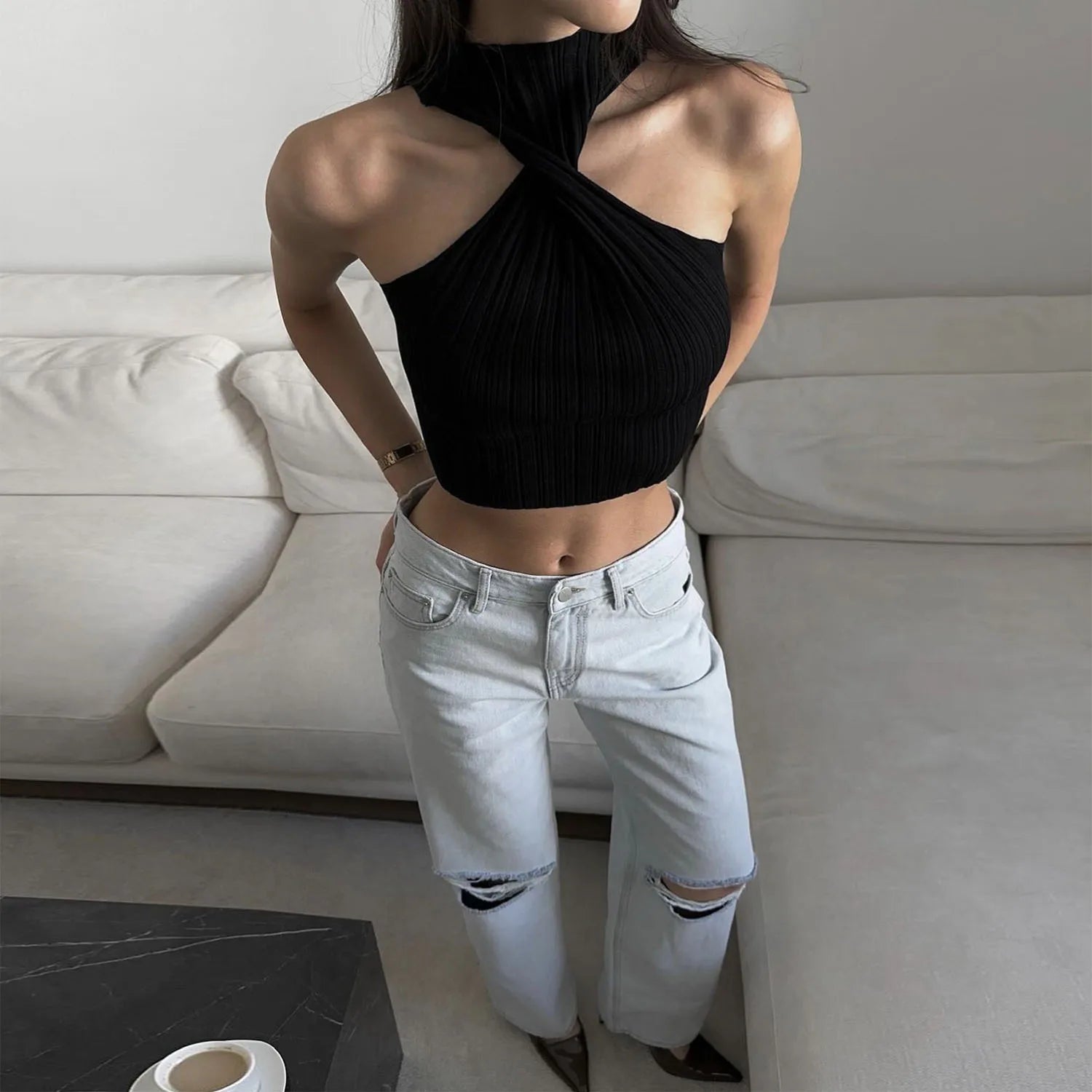 Women's Knitted Sleeveless Halter Crop Top - Twist Front Top Coquette