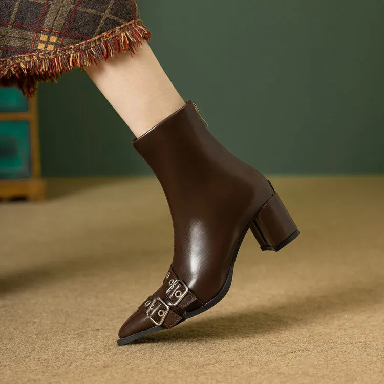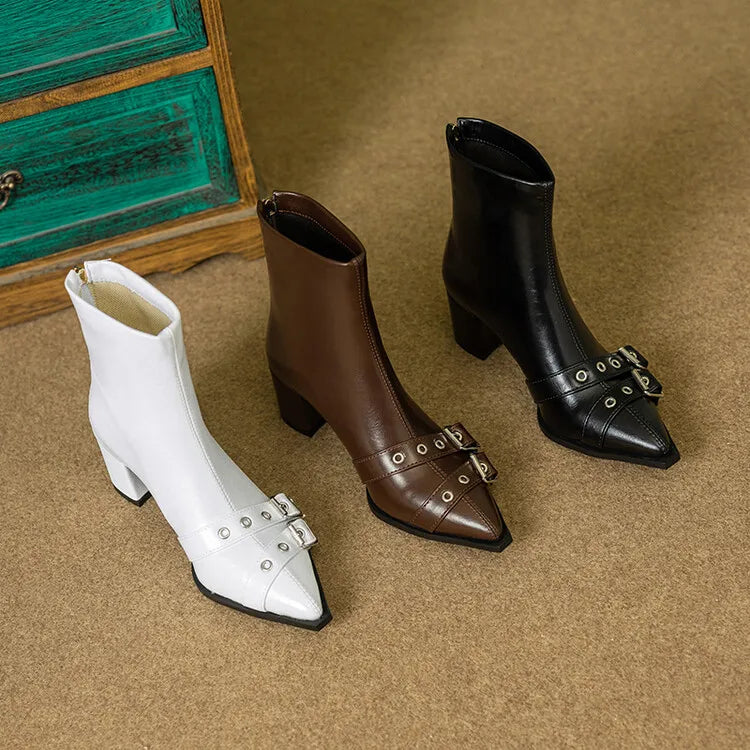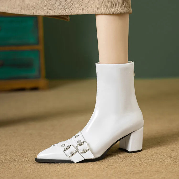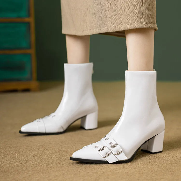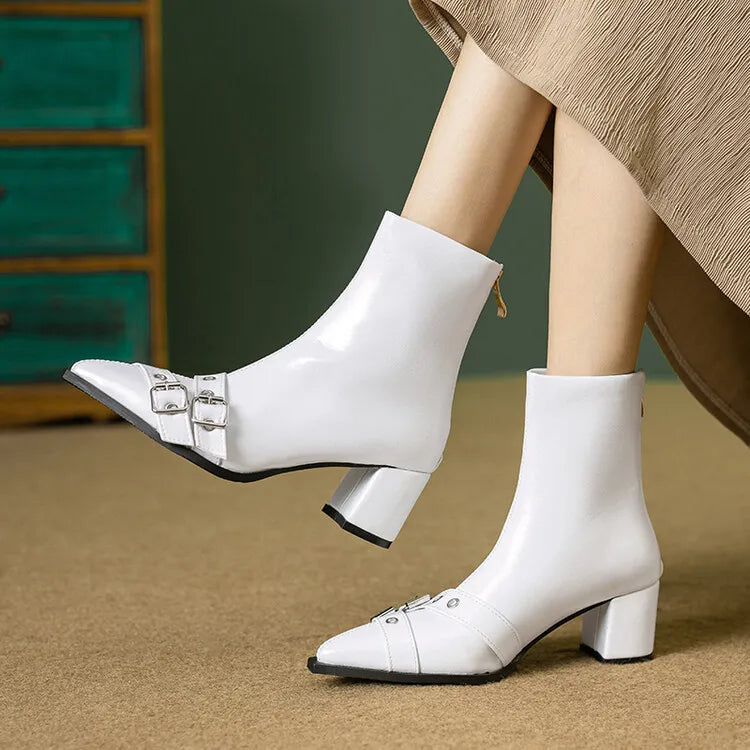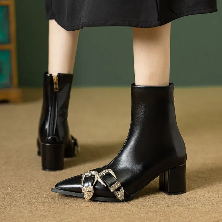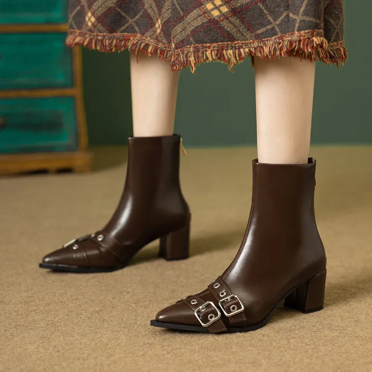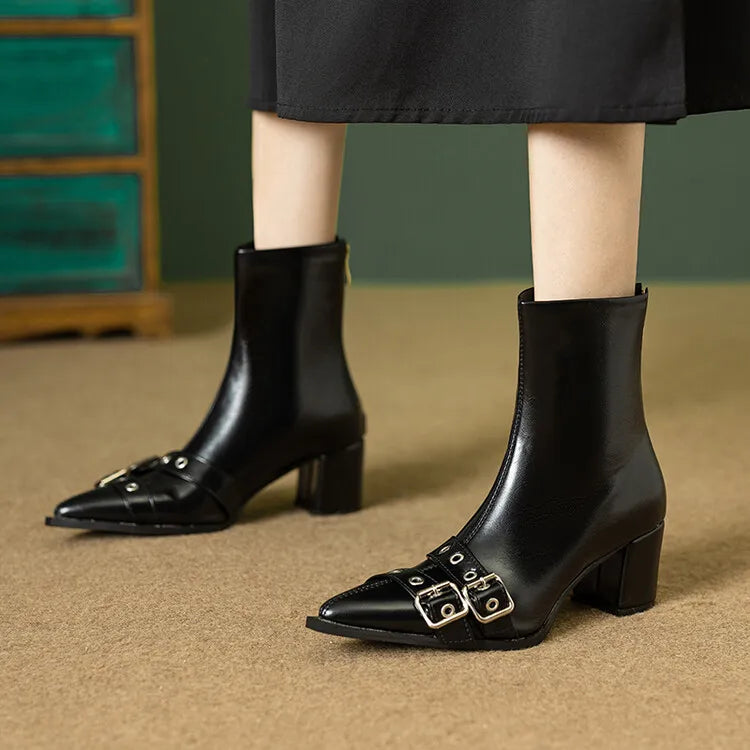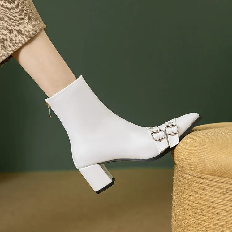 Women's Leather Metal Belt Buckle Short 6cm Square Heel Rivet Boot Back Zipper Boots