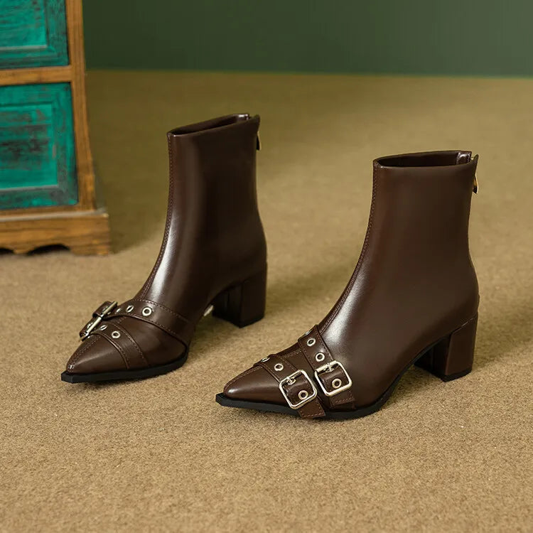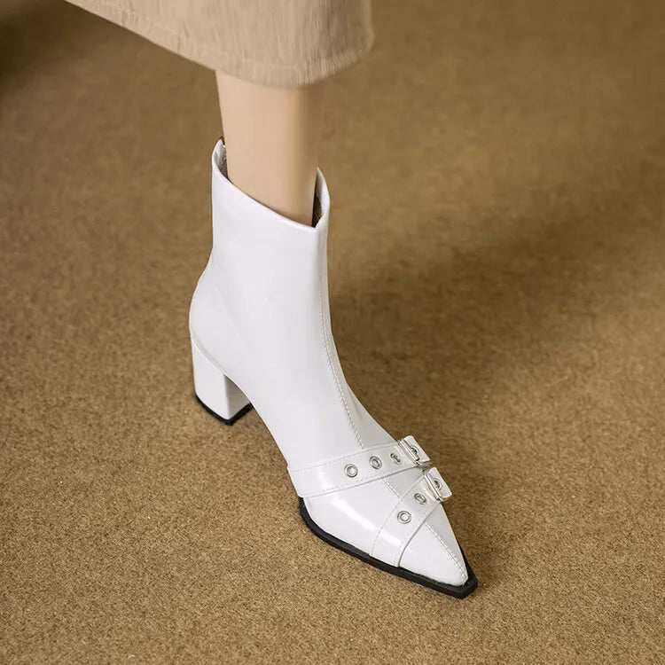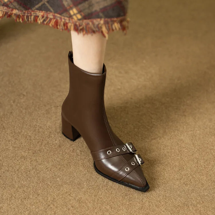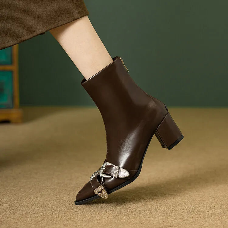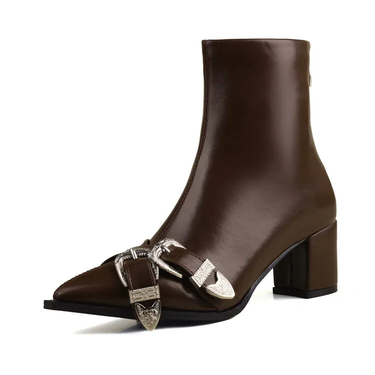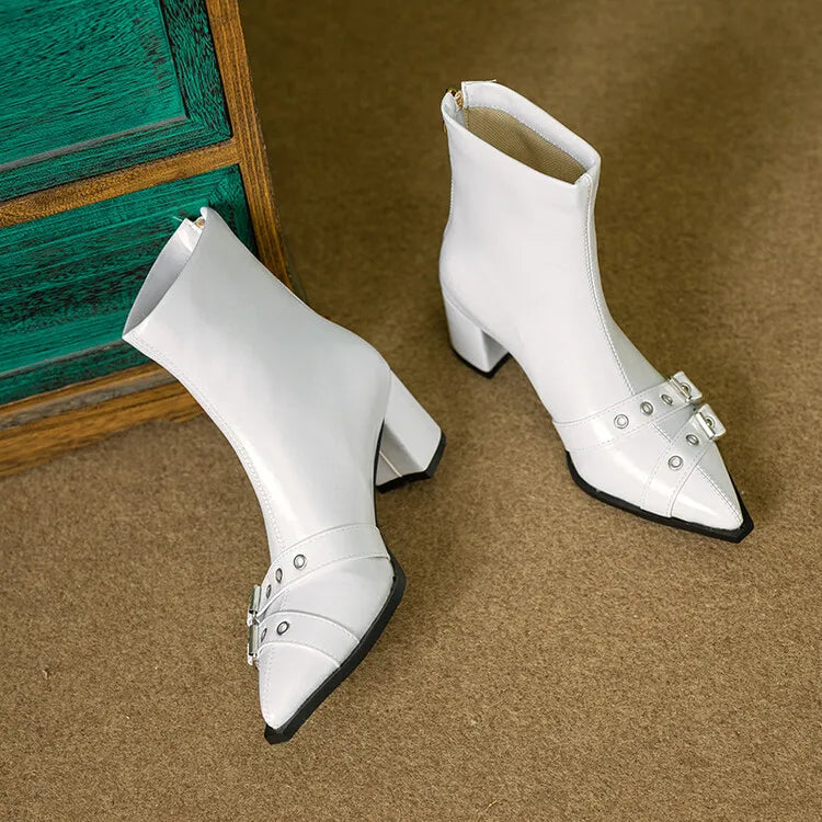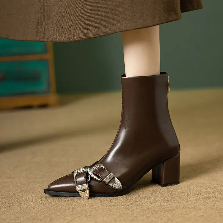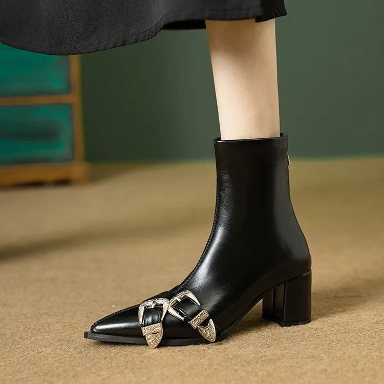 Women's Leather Metal Belt Buckle Short 6cm Square Heel Rivet Boot Back Zipper Boots