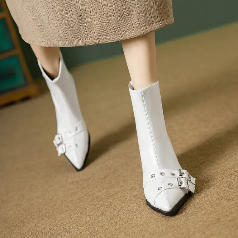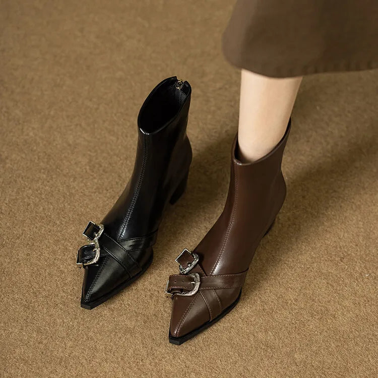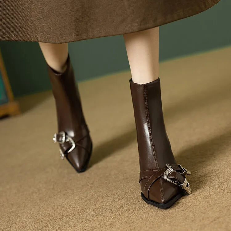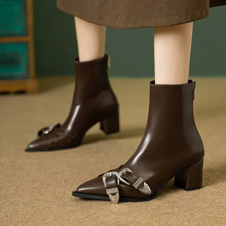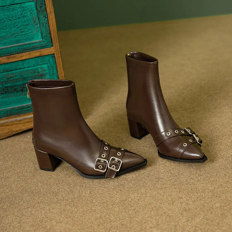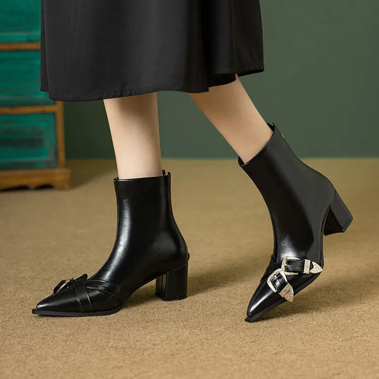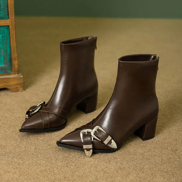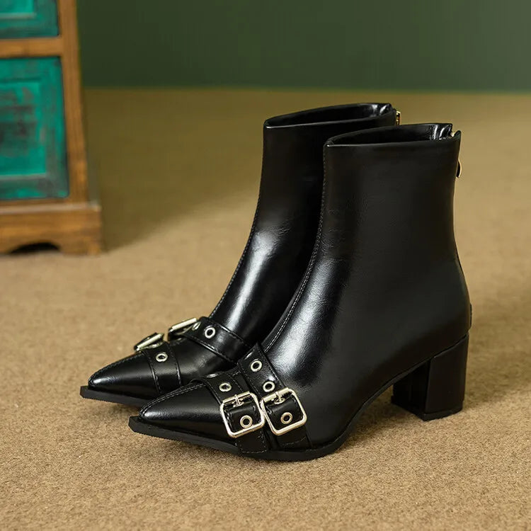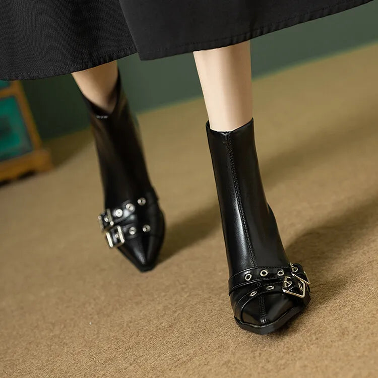 Women's Leather Metal Belt Buckle Short 6cm Square Heel Rivet Boot Back Zipper Boots