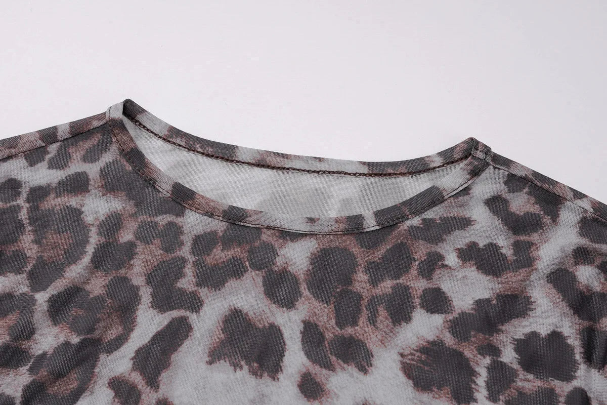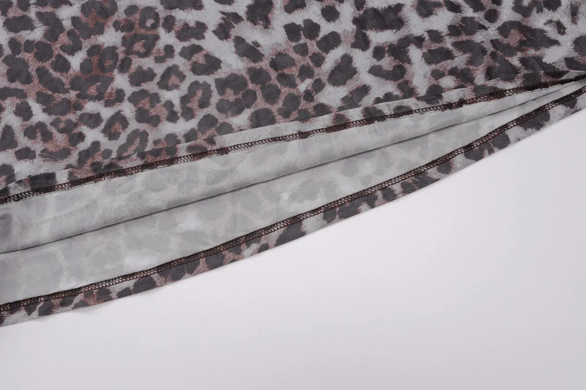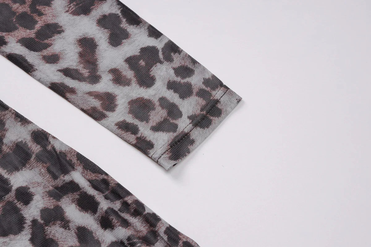Women's Leopard Print Long Sleeve Mini Dress - Two Piece Sets Outfit Mesh Sheer Dress