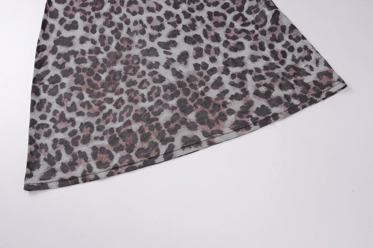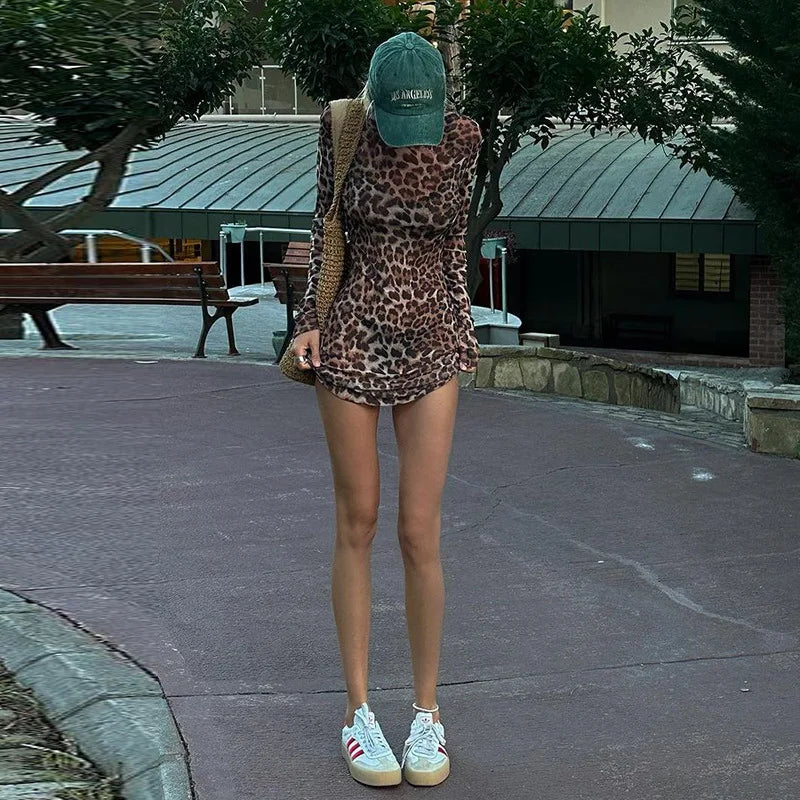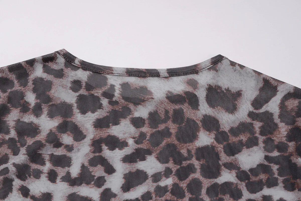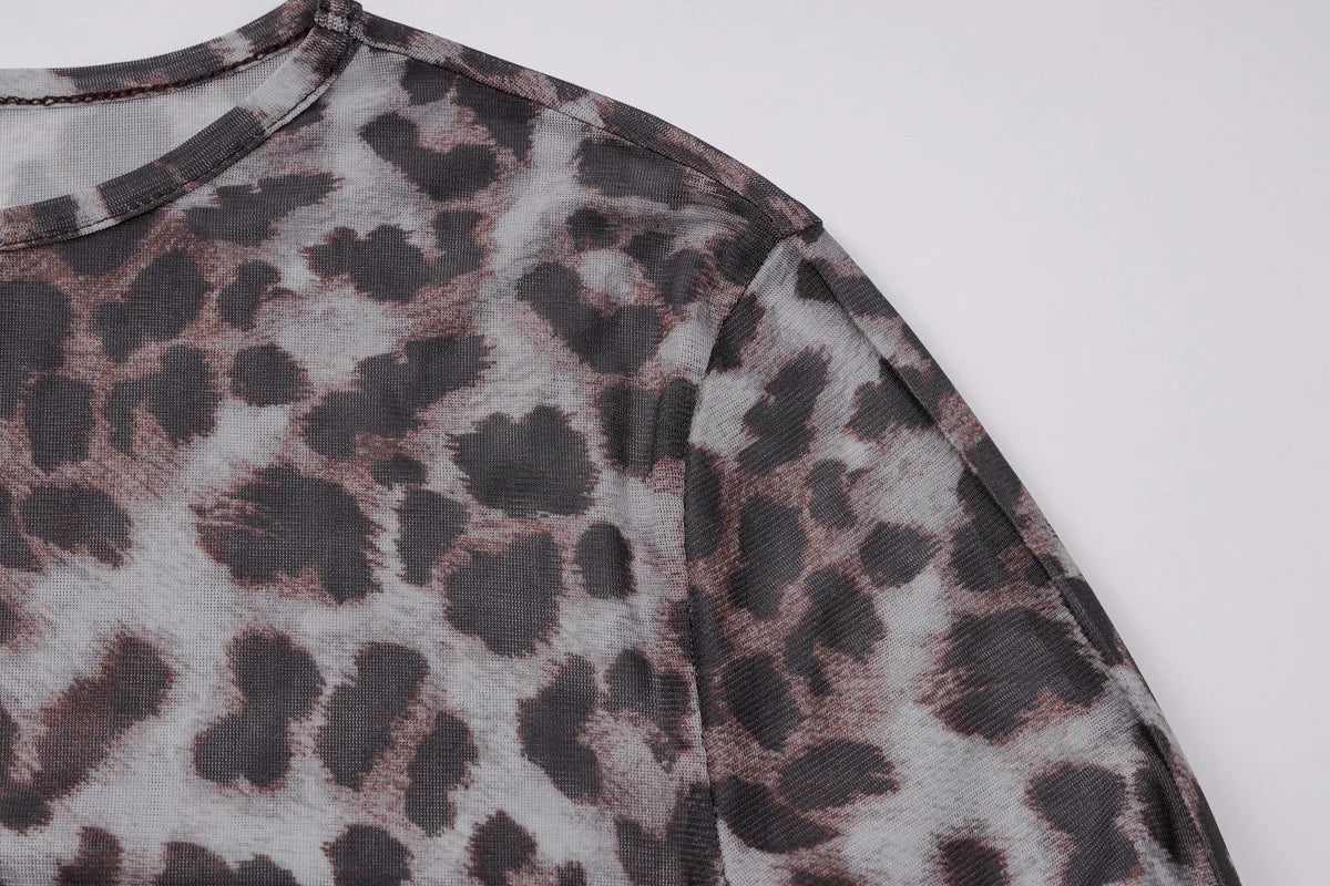 Women's Leopard Print Long Sleeve Mini Dress - Two Piece Sets Outfit Mesh Sheer Dress