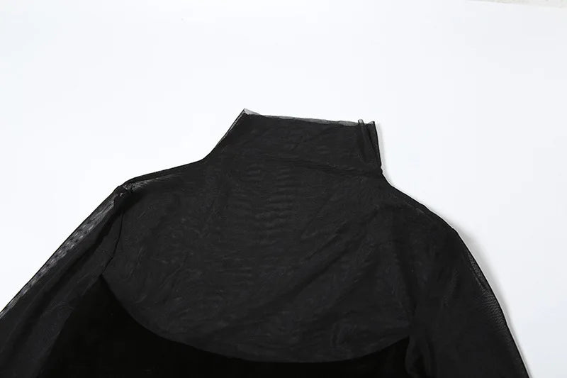 Women's Long Sleeve See Through Mesh Velvet Party Gown Black Turtleneck Bodycon Dress
