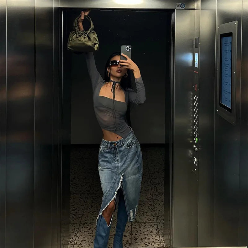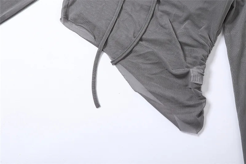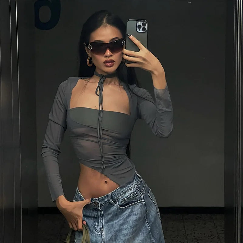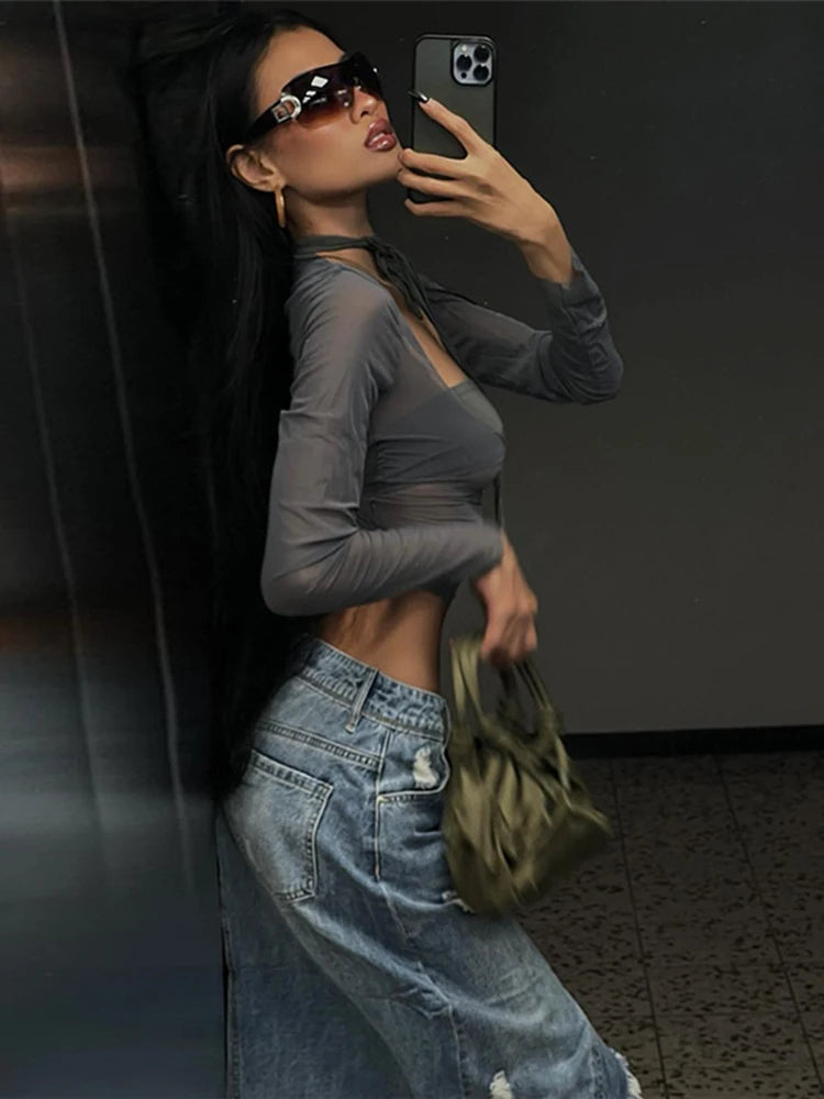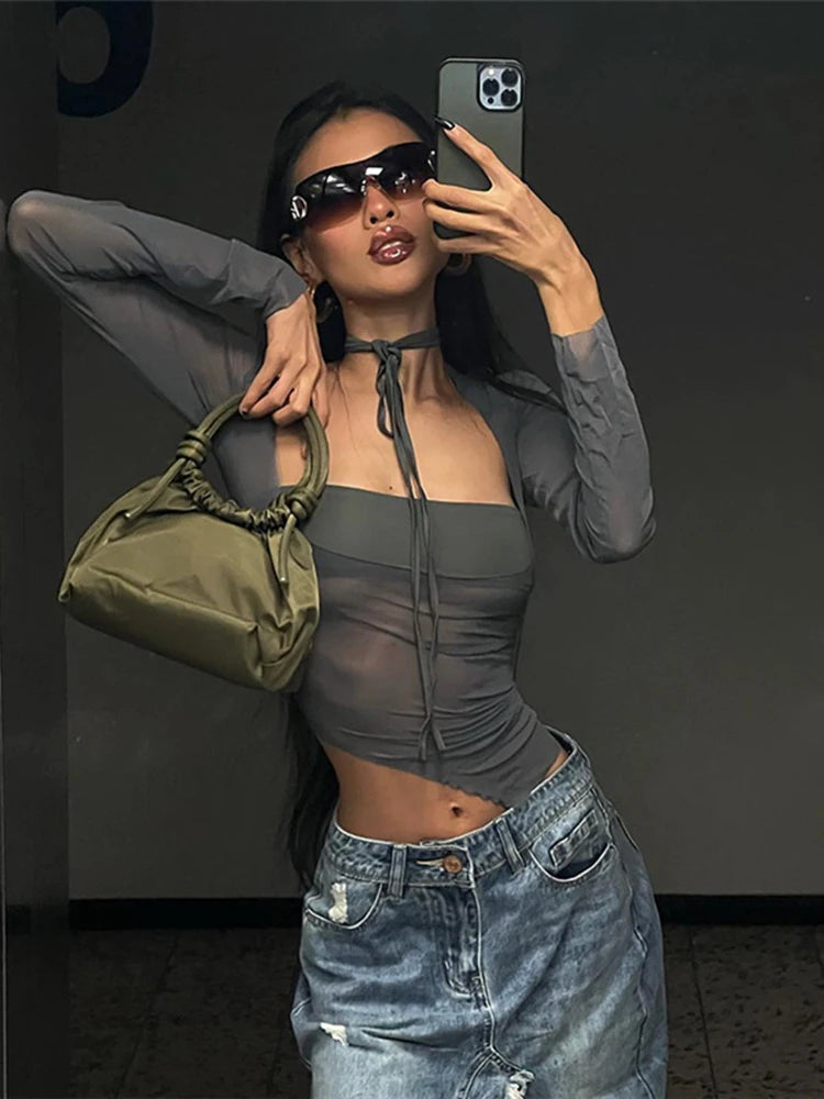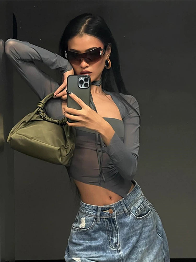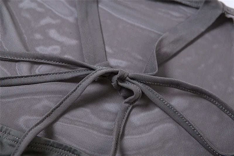 Women's Mesh Sheer Halter Top - Square Collar Short Sleeve Cropped Top