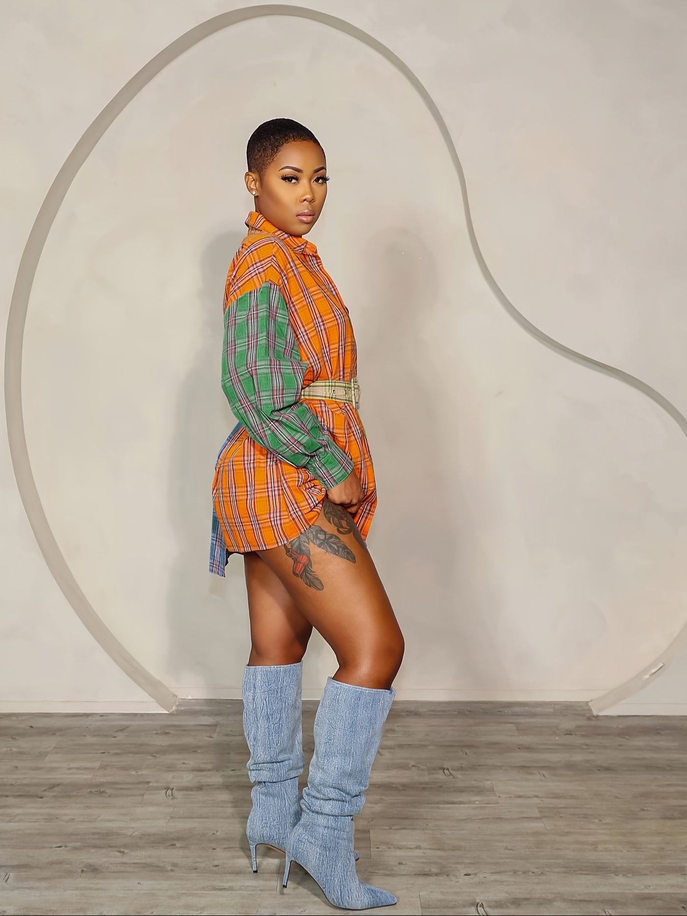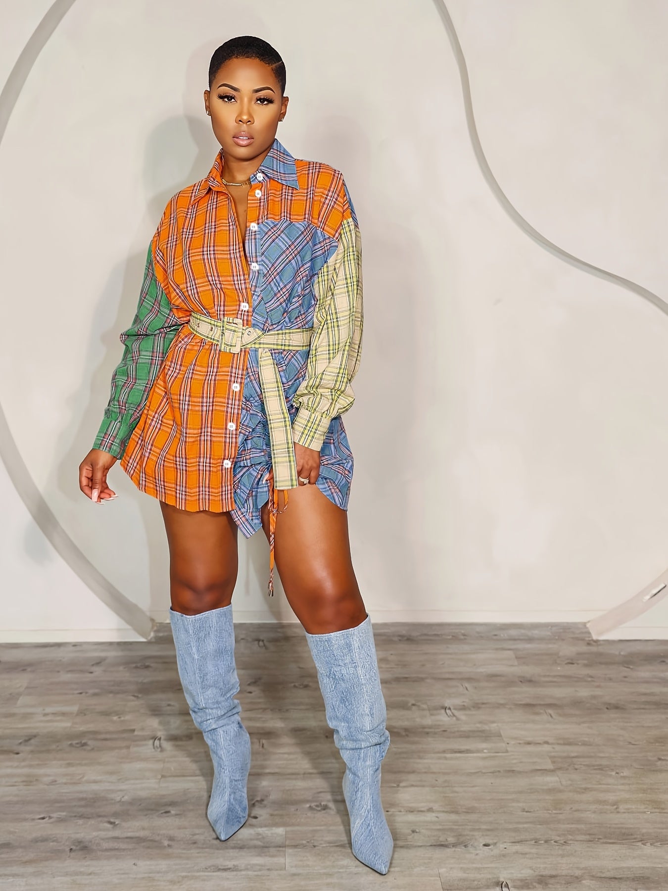 Women's Plaid Print Long Sleeve Button Front Belt Dress