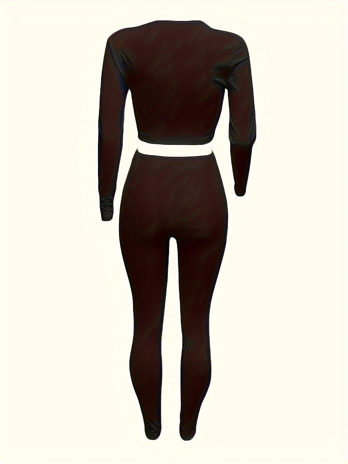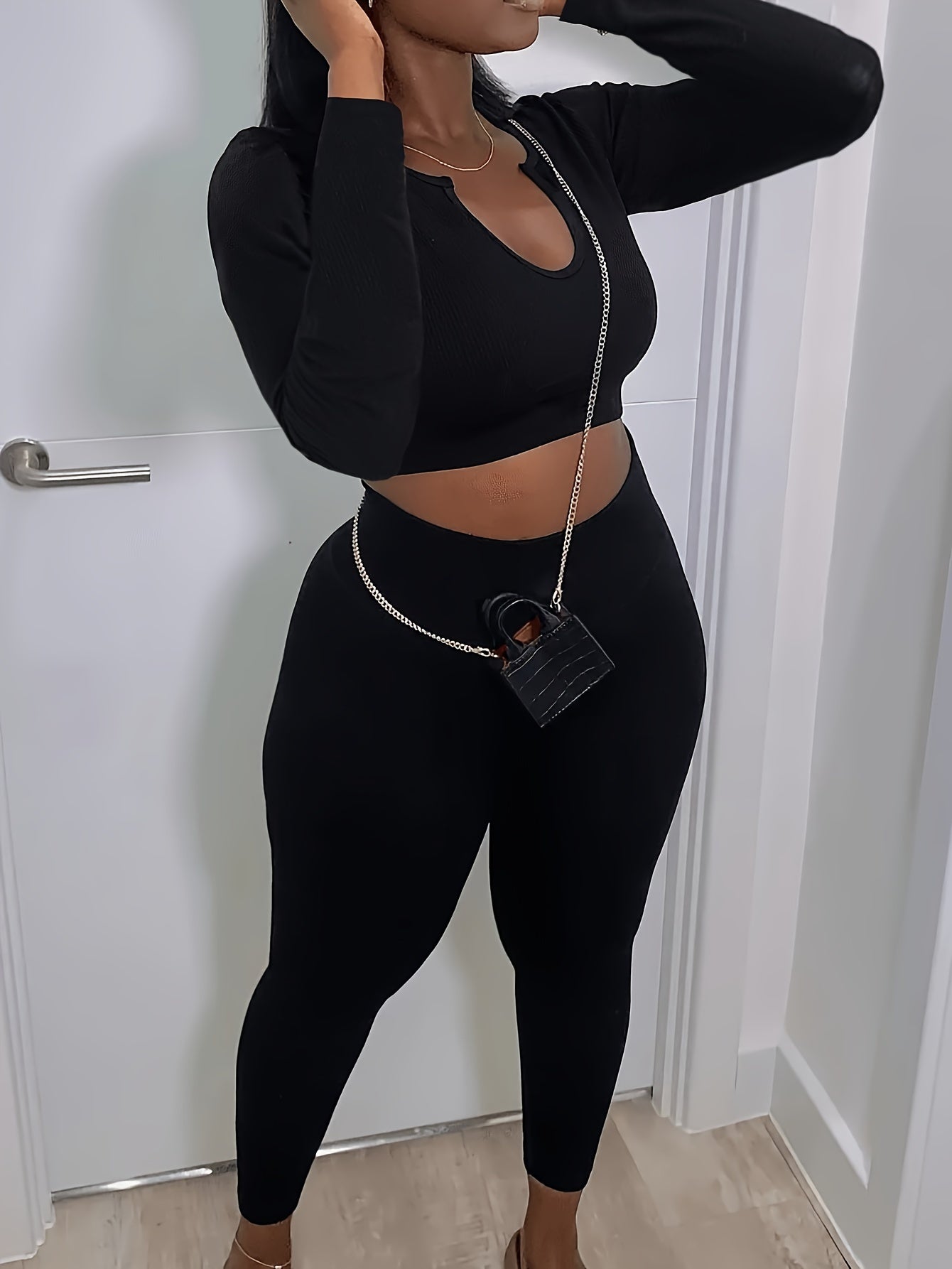 Women's Plus Size Leggings Set, Notched Neck Long Sleeve Crop Top & Leggings Outfit
