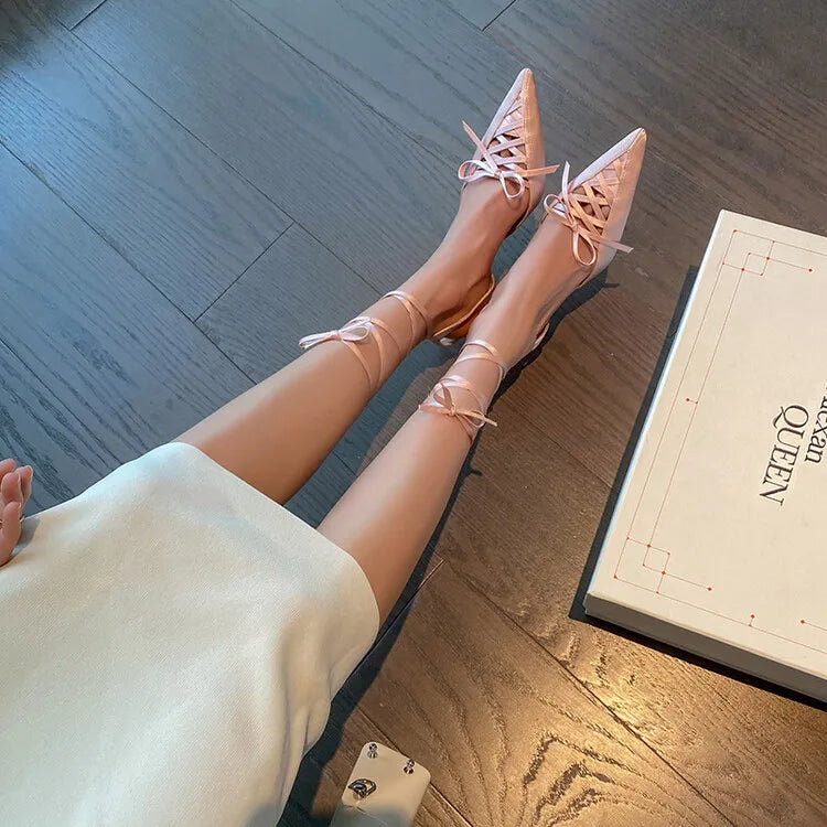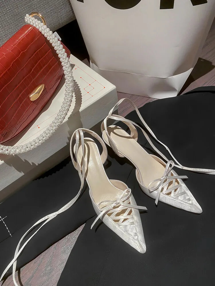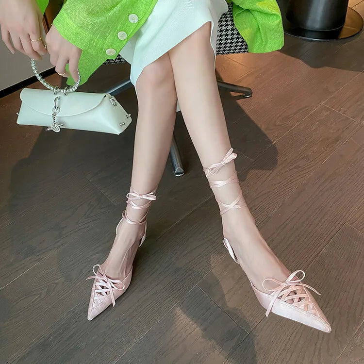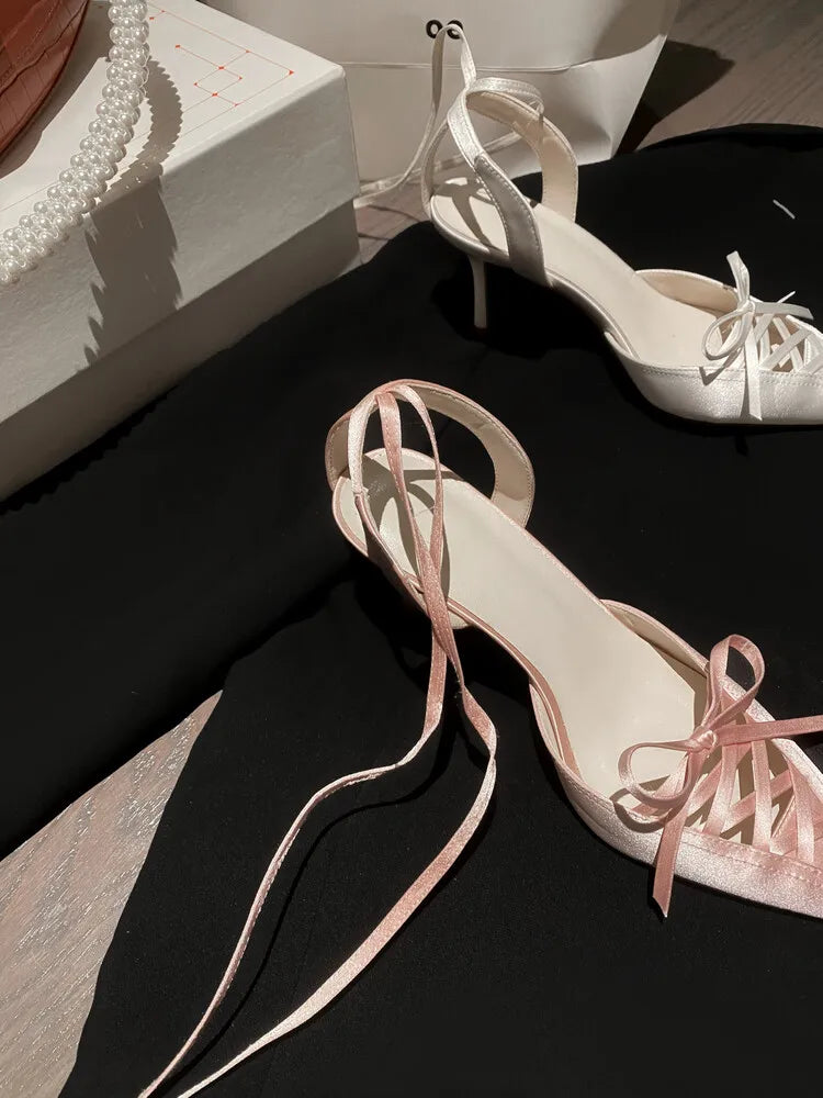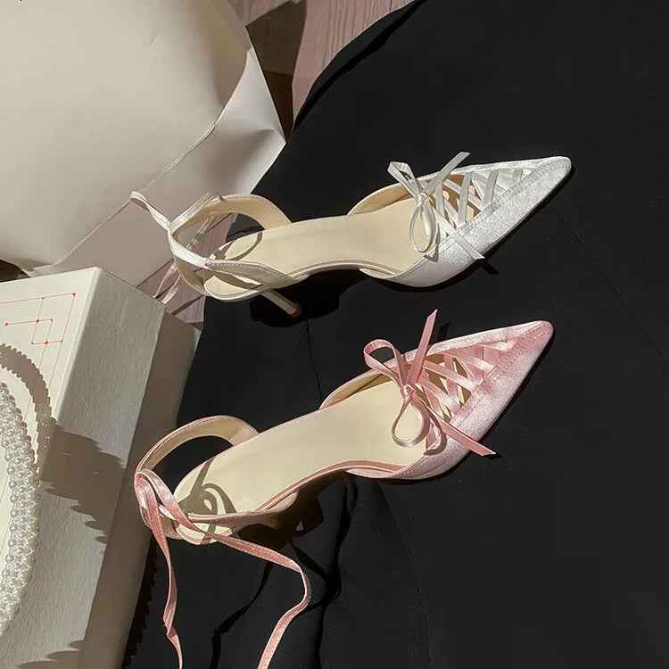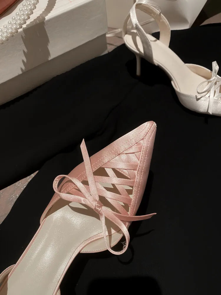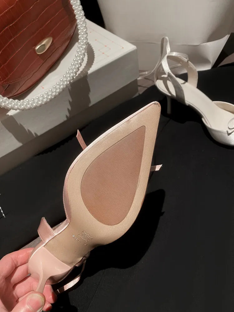 Women's Satin High Heel Sandals Strap 7cm Heel Sandals Bow Pointed Shoes