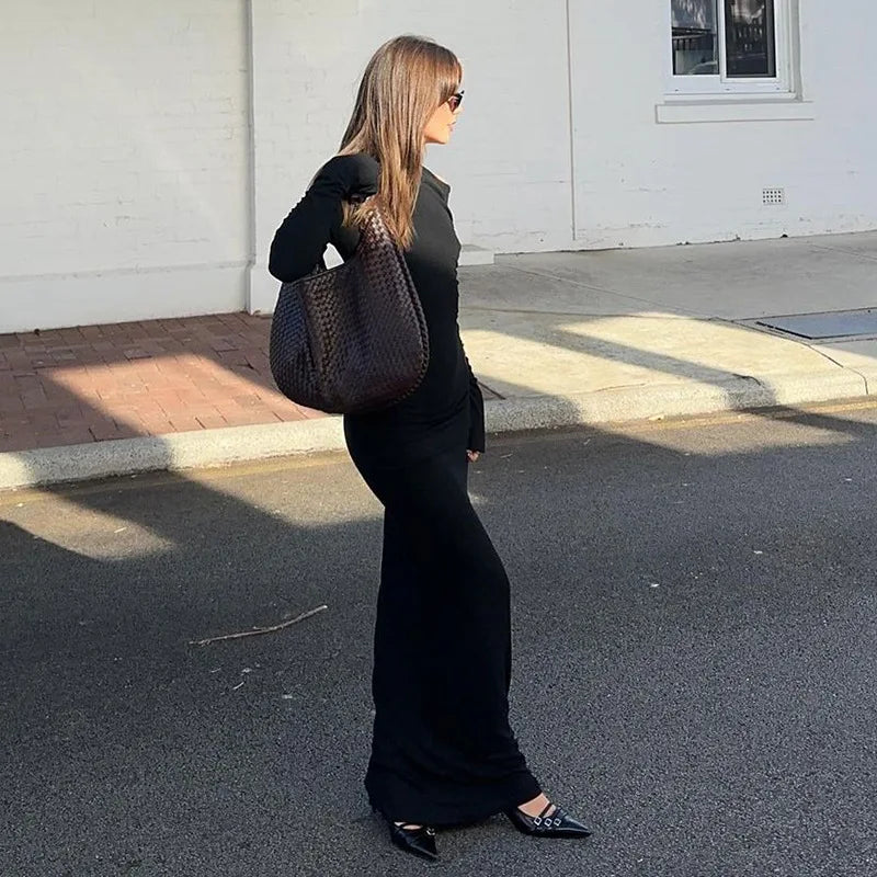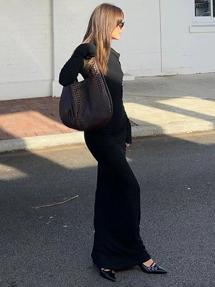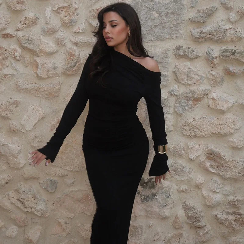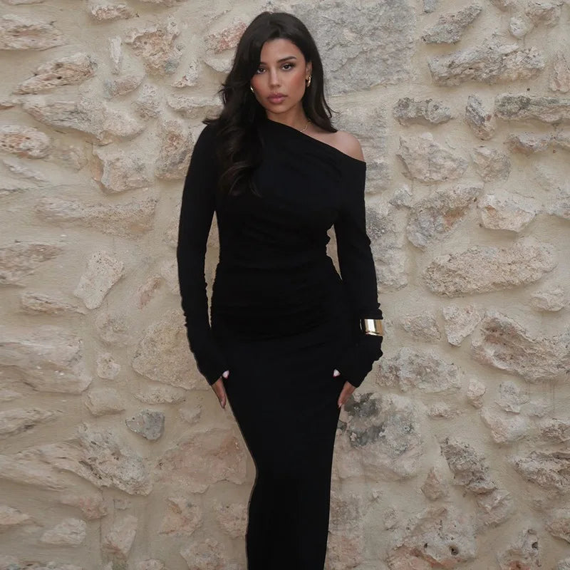 Women's Skew Collar Long Sleeve Maxi Bodycon Elegant Party High Waist Dress
