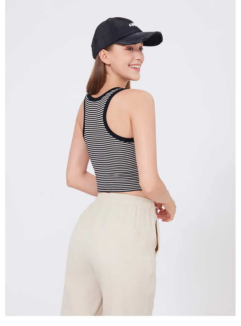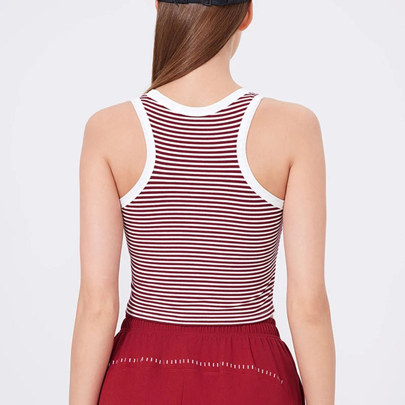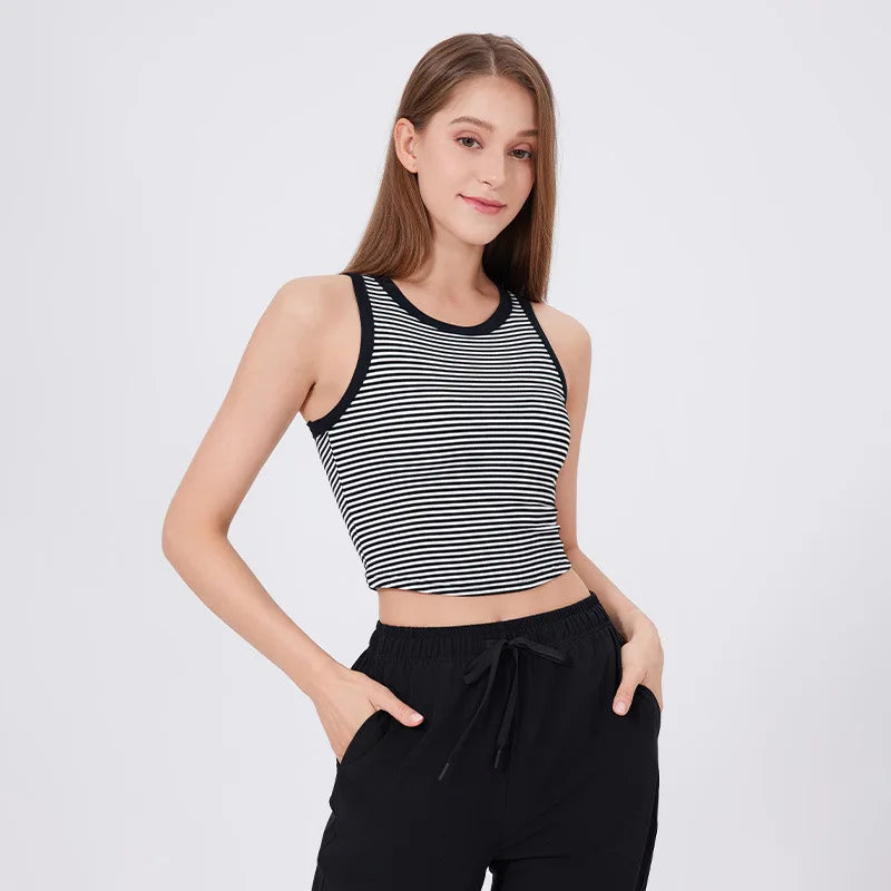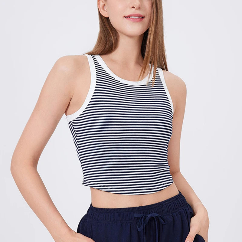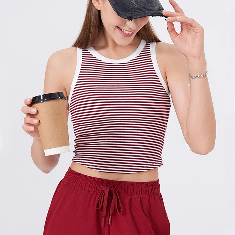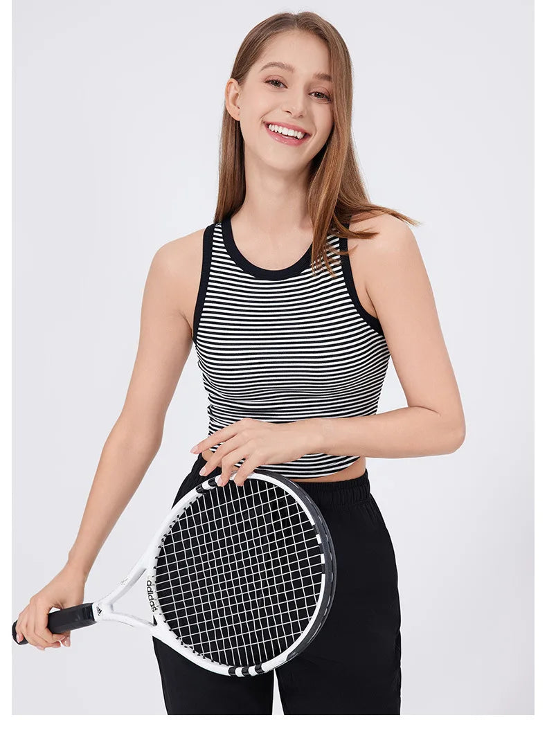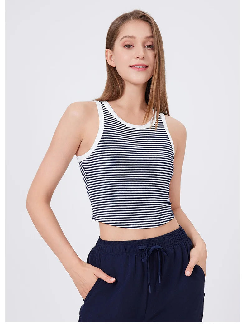 Women's Sleeveless Gym Crop Top Summer Stripes Running Vest With Chest Pads Breathable Quick Dry Sportswear Workout Vest