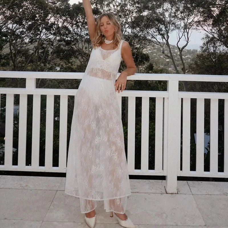 Women's Sleeveless Hollow Lace Cover Up See Through Beach Long Dress