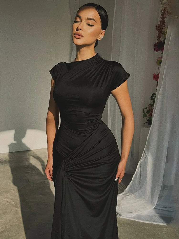 Women's Slim Pleated Lace Up Maxi Short Sleeve Draped Elegant Party Long One Step Dress