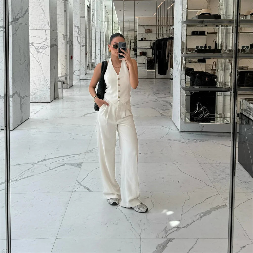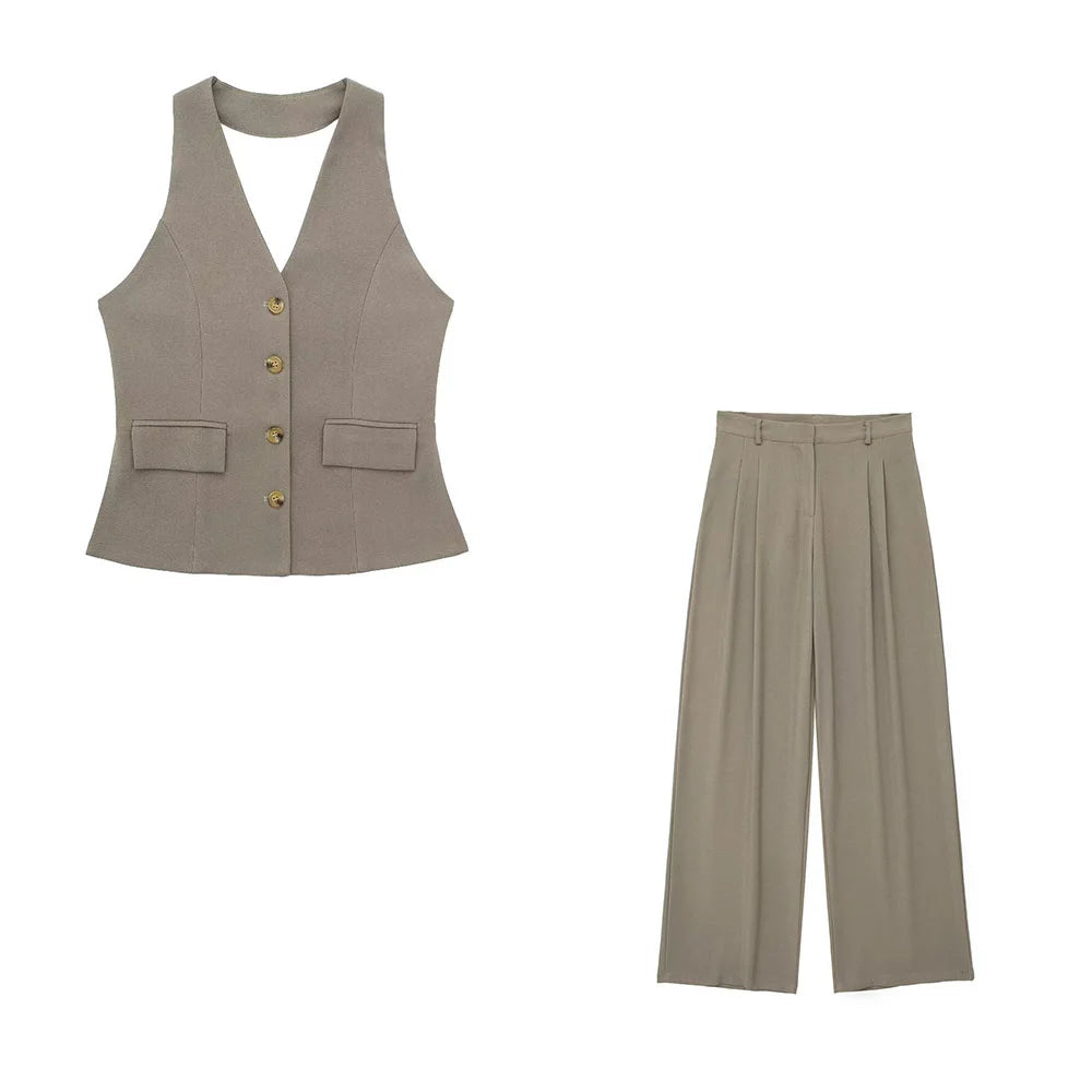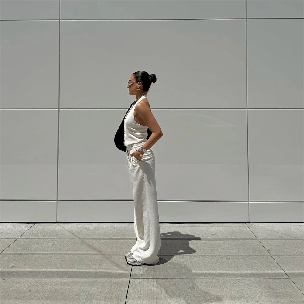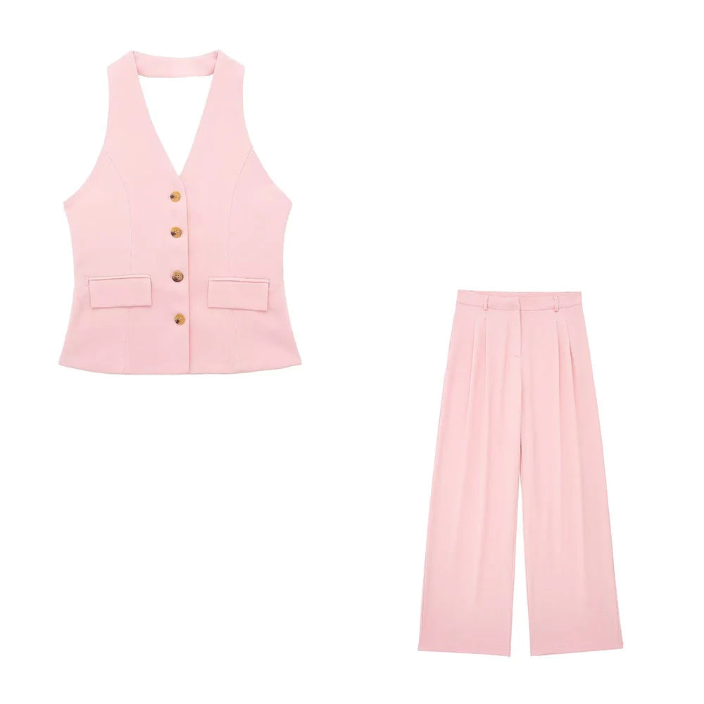 Women's Solid Colour Backless Hanging Neck Collar Vest Long Trousers Set