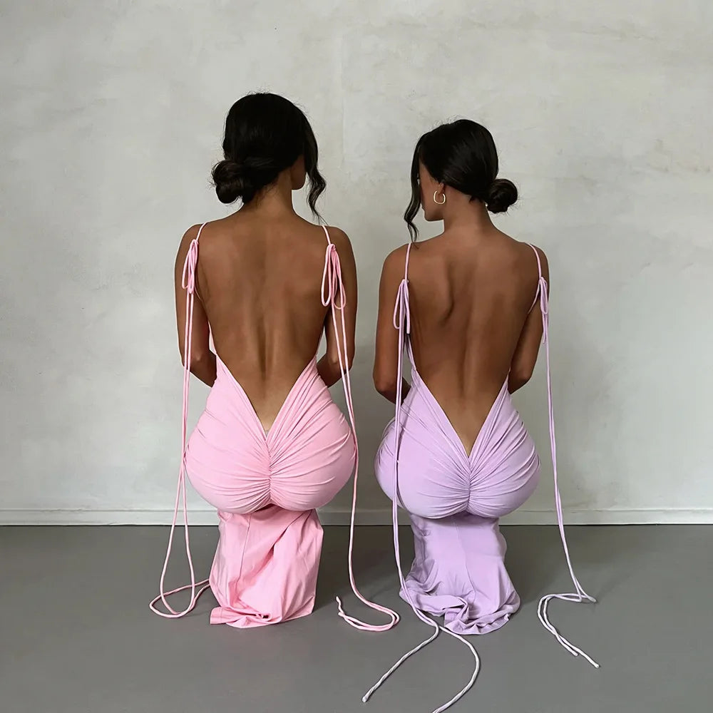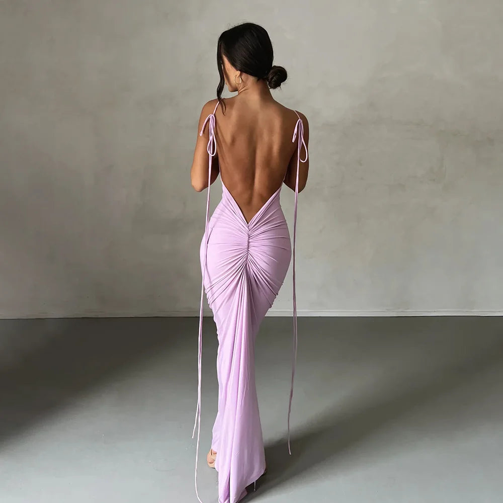 Women's Spaghetti Strap Backless Maxi Ruched Dress Outfit