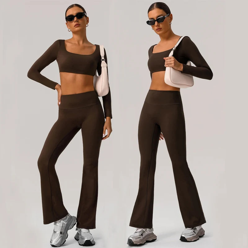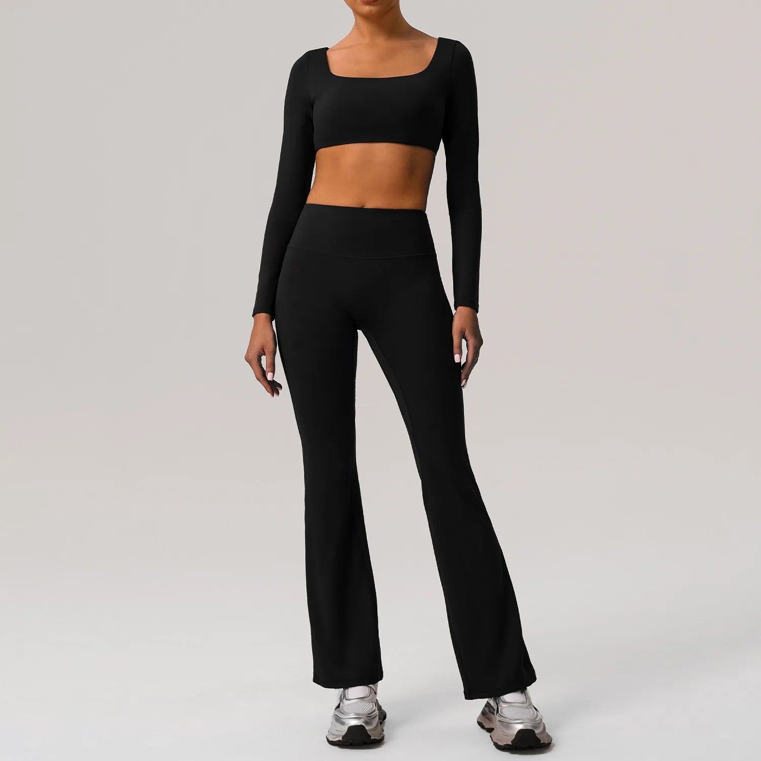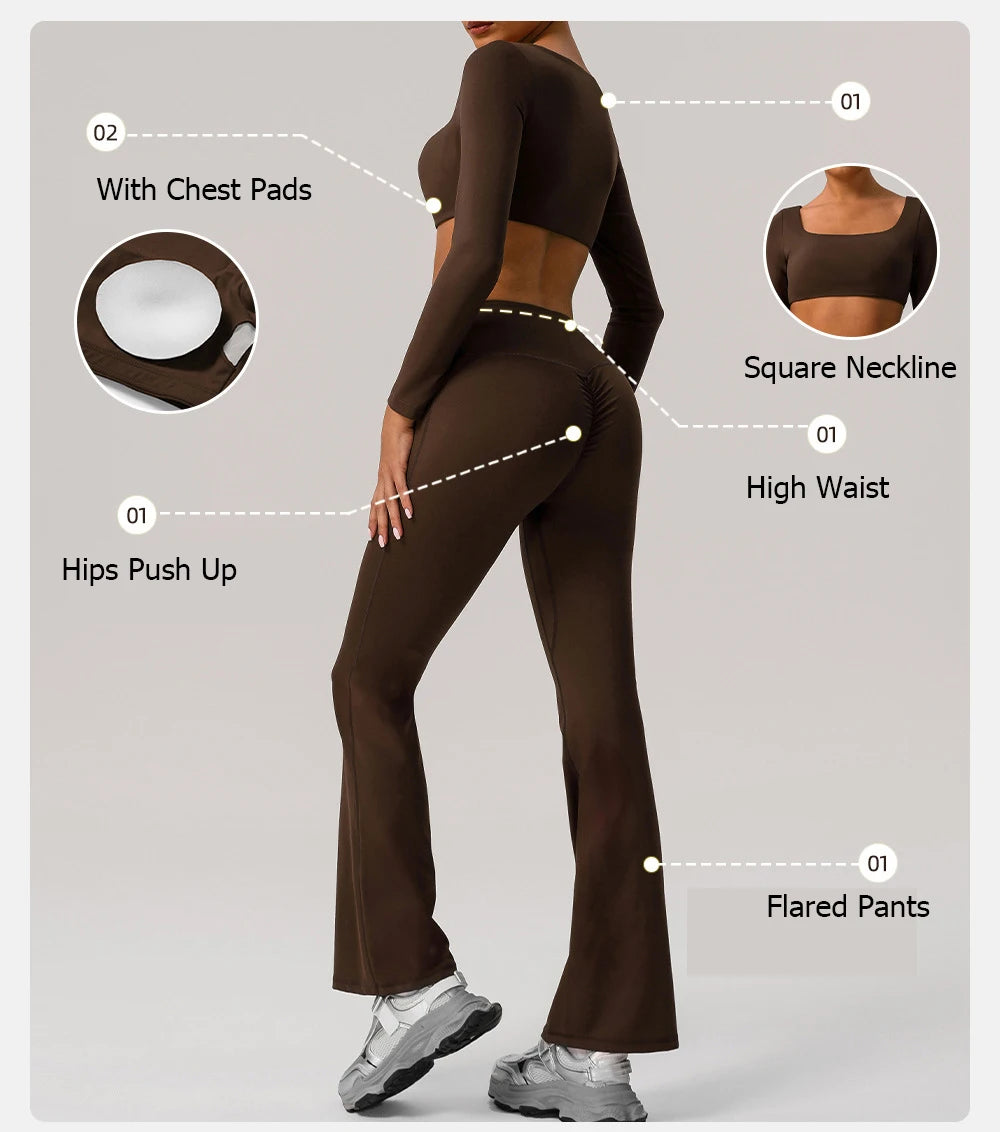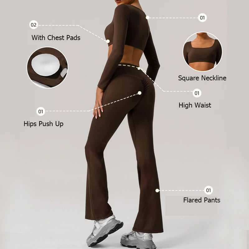 Women's Two Pieces Fitness Yoga Set Solid Colour Long Sleeve Gym Suit Breathable Quick Dry Running Sportswear Outfit